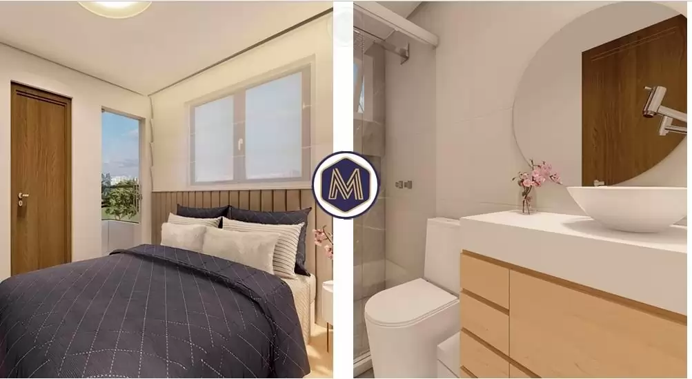 1 quarto com suíte, banheiro com bancada em granito, cuba de